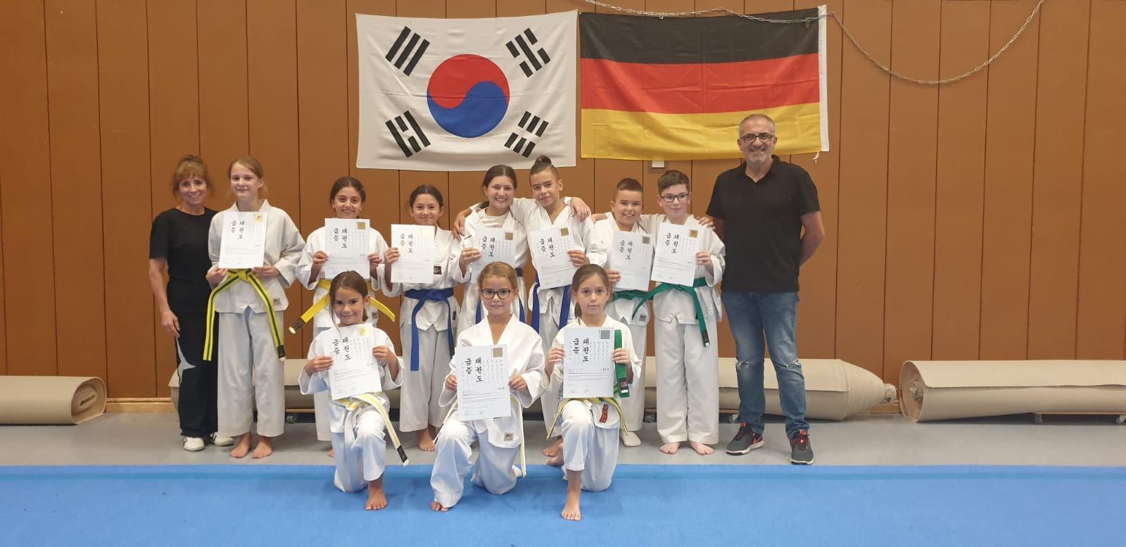 Ein wichtiges Merkmal der Taekwondo Sportler ist der Gürtel, auch Kup genannt. Er zeigt an, über welche Fertigkeiten der Kämpfer verfügt. In regelmäßigen Abständen werden Prüfungen abgelegt. Beim Bestehen steigt man in den nächsten Kup auf. Die Farben reichen vom Anfänger mit einem weißen Gürtel, dem 10. Kup bis zu rot-schwarz, dem 1. Kup. Erst nach dieser Stufe wird der schwarze Gürtel verliehen und die Schüler steigen zu Meisterschülern auf. Am 15. September haben folgende Mitglieder zwischen 7 und 13 Jahren ihre Prüfung erfolgreich bestanden: