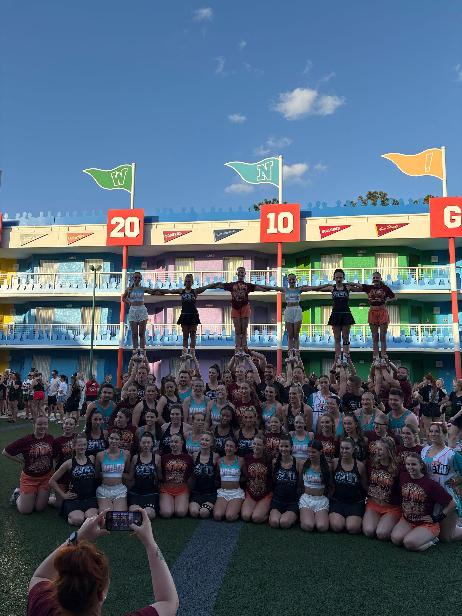 Vor den Wettkämpfen trainierte das Team von Samstag bis Montag jeweils in einer Trainingshalle intensiv an ihrer Performance, um optimal vorbereitet in die kommenden Wettkämpfe zu starten. Am Dienstag folgten weitere Trainingseinheiten auf dem Footballfeld des Disney Allstar Resorts, gemeinsam mit zwei weiteren deutschen Teams. Hier wurde sich fleißig gegenseitig angefeuert und unterstützt – eine wertvolle Erfahrung für Teamgeist und Motivation.