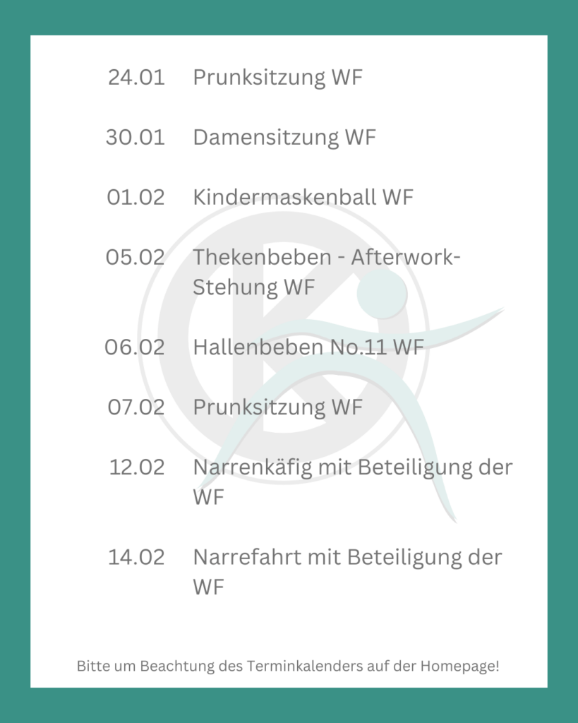 Das neue Jahr ist gestartet und die ersten Veranstaltungen des Vereins sind auch schon gemeistert worden. Der Januar und Februar halten außerdem einige Leckerbissen bereit. Der reguläre Spielbetrieb unserer Mannschaften nimmt nach der kurzen Weihnachtspause wieder Fahrt auf. Unsere närrische Zeit startet mit den Weissen Fräck – die Jahnhalle wird zum Hauptquartier. Karten für alle Sitzungen (außer die Damensitzung) gibt es noch online und in den Vorverkaufsstellen. Jetzt schnell sichern!