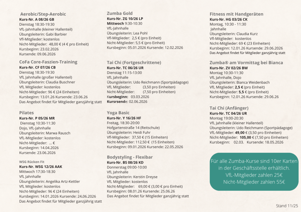 Neben unseren festen Trainingsgruppen bieten wir auch Sportkurse an. Eine Teilnahme an unseren Kursen ist nicht an eine Mitgliedschaft im VfL 1848 Bad Kreuznach gebunden. Damit möchten wir allen Interessierten das Thema Bewegung näherbringen und dazu anregen, ganz unverbindlich mitzumachen und etwas für ihr persönliches Wohlbefinden zu tun.