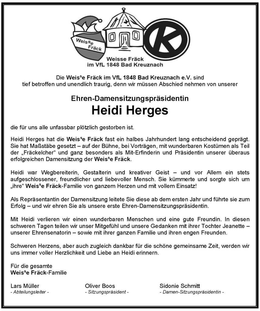 Der VfL 1848 Bad Kreuznach e.V. mit seiner Abteilungen Weisse Fräck trauert um ihre Ehren-Damensitzungspräsidentin und gute Freundin Heidi Herges, die im Alter von 81 Jahren verstarb.