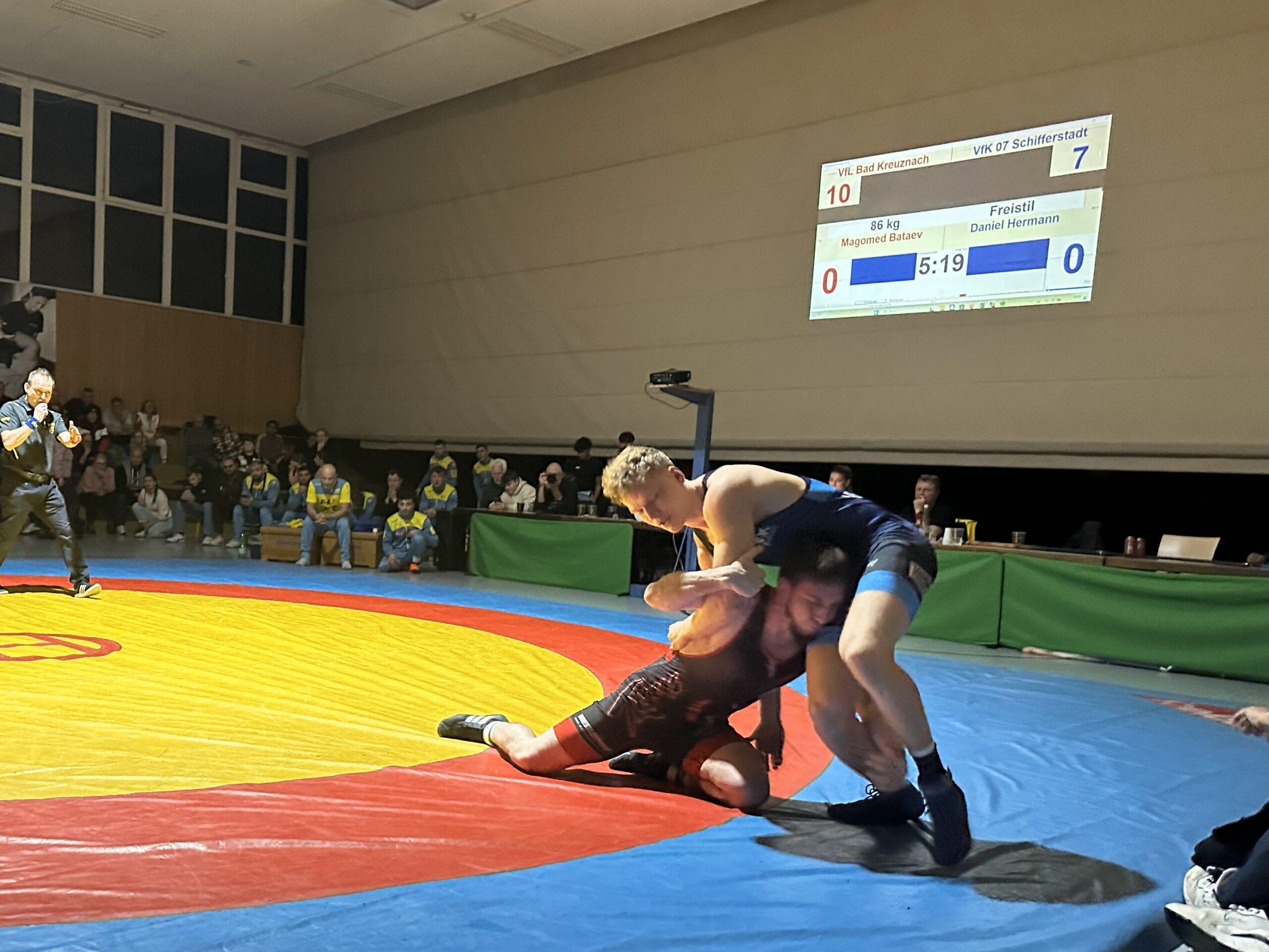 Magomed Bataev (86 kg Freistil) tritt auf wie ein Mann mit einer Mission. Mit klarem Plan, hoher Kontrolle und viel Druck trieb er seinen Gegner Daniel Hermann durch den Kampf. Immer wieder zwingt er ihn zu Fehlern, punktet konsequent. Am Ende ein klares 10:0 – Bad Kreuznach führt wieder.